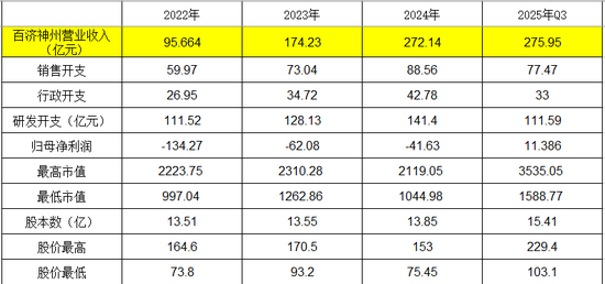 2025年前三季度,百济神州的营业收入已超过恒瑞医药的231.9亿元为275.95亿,但其2025年峰值市值只有3535.05亿港元,远低于恒瑞医药的4721亿人民币。