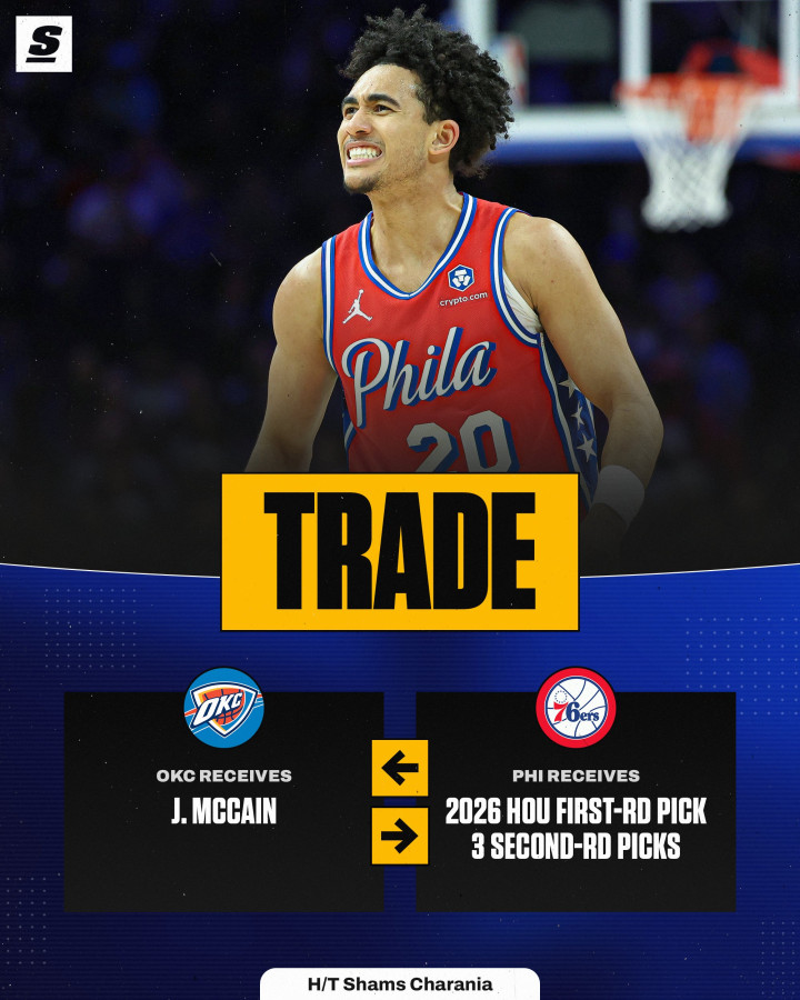 据ESPN名记Shams报道,76人把麦凯恩交易到雷霆,换来1个首轮签和3个次轮签,