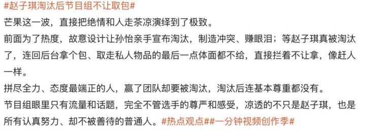 但确切让赵子琪破防、凯旋开直播硬刚的,还不是淘汰自身,而是淘汰后节目组的一系列操作,险些把不尊重东谈主写在了脸上。
