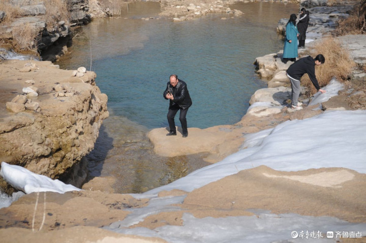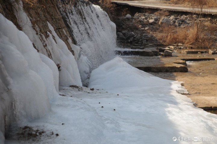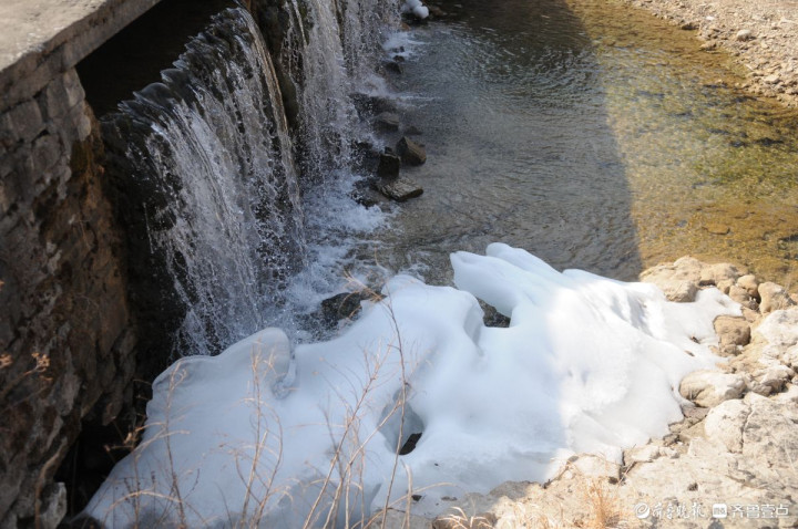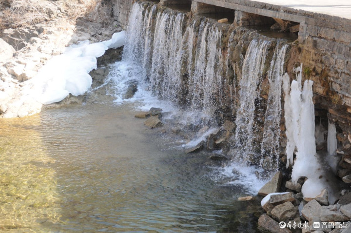 在淄博市淄川区峨庄古村庄国度丛林公园,峨河里静静流淌的河水与冰雪组成一幅自然协调的生态画卷。 闫盛霆 摄