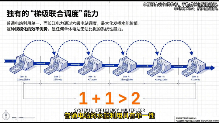 长江的天然水能资源具有唯一性,ag百家乐app优质的建坝区位已完成布局。对于后来者来说,这不仅有资金门槛,更有天然的地理资源约束。更关键的是它独有的梯级联合调度能力。普通电站的水能利用具有单一性,而长江电力的水能能通过6级电站的梯级调度最大化发挥水能的利用价值。这种规模化的效率优势是任何单体电站都无法比拟的系统性能力。