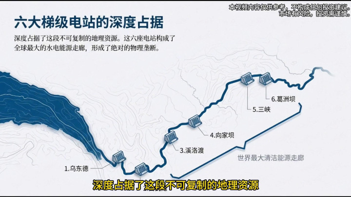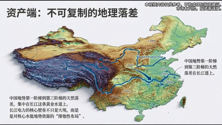 ·再看资产端,它的核心壁垒不只是大坝,而是对核心水能地势资源的"排他性布局"。中国地势第一阶梯到第三阶梯的天然落差集中在长江这条黄金水道上,而长江电力通过6座梯级电站深度占据了这段不可复制的地理资源。