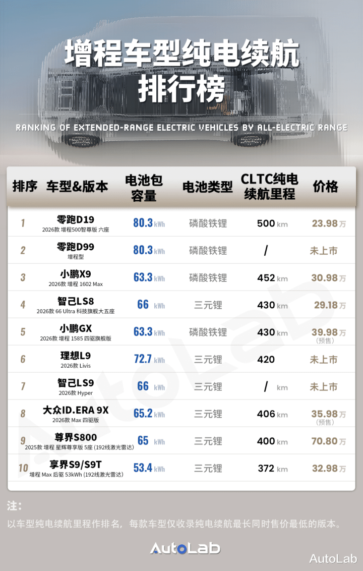 这份榜单中,纯电续航名纪律一的增程车是零跑D19,500km CLTC纯电续航、80.3度磷酸铁锂电板、23.98万的订价,班师把增程混动的续航门槛拉到了新高度。