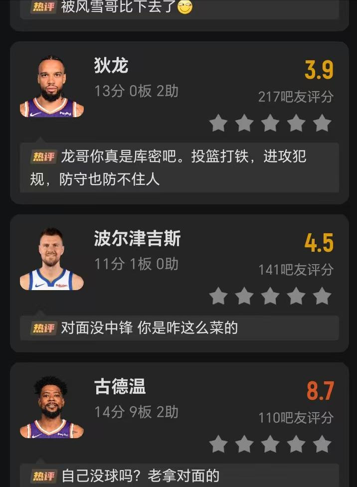下半场的库里,还是有好几次冲突后重摔在地了,不得不说这么的画面照旧让球迷们相配的揪心。鄙人半场中,骁雄给球迷的嗅觉即是蓦的不会打球了,最终骁雄不敌太阳无缘季后赛,赛后评分,库里、狄龙、奥尼尔齐不足格,格林和古德温高分。