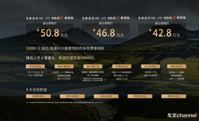 此款设置是全新坦克700初学版和最低配,价钱最低廉。不外,诚然价钱低廉,此款设置竞争力十分强悍,外形内饰空间和其它设置基本雷同,重要的设置方面,也基本给到了满配。智能设置方面,搭载了激光雷达版的驾驶辅助,援助城区领航和高速领航;舒坦设置方面,雪柜彩电大沙发沿途搭载,给到普遍的舒坦体验;重要的能源系统,则搭载Hi4-Z插混能源,这亦然新款坦克700的最大变化。